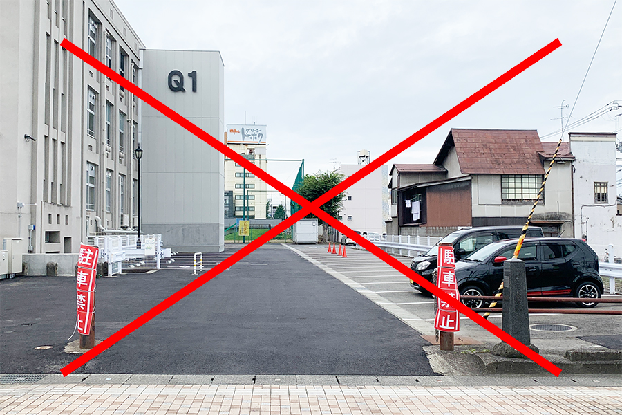 Q1に隣接する市立第一小学校の駐車場は利用できません。Q1斜向かいの専用駐車場をご利用ください。Q1は第一小学校現校舎が隣合う施設です。ご来館の際は児童への配慮のある行動をお願いいたします。