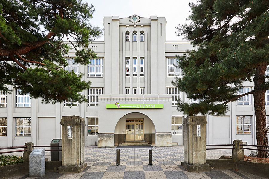 1927(昭和2)年に建てられたこの旧一小は、山形県初の鉄筋コンクリート造の学校建築。設計は、上山市出身の秦鷲雄と西川町出身の伊藤高蔵の二人による秦・伊藤設計事務所(当時)が担いました。また、建築構造学の第一人者で都復興院建築局長、東京市建築局長を歴任し、復興小学校の陣頭指揮をとった佐野利器(白鷹出身)が指導、助言したと言われます。この建造物はドイツ表現主義やアールデコの影響が見られるなど、構造としてもデザインとしても当時の日本の最先端のものでした。以来、約80年に渡り山形市中心街の小学校としての機能を果たし、その役割を終えてからも、その歴史的価値から2001(平成13)年に国登録有形文化財に登録され、2009(平成21)年には近代化産業遺産に認定されました。