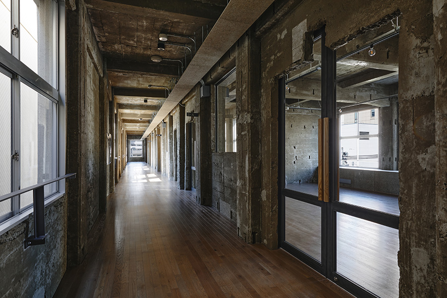 壁や天井が荒々しく剥き出しされている躯体の姿をできるかぎりそのままに見せるデザイン。旧一小の時間や記憶の蓄積と新しいクリエイティブが生まれる気配が入り交じる。