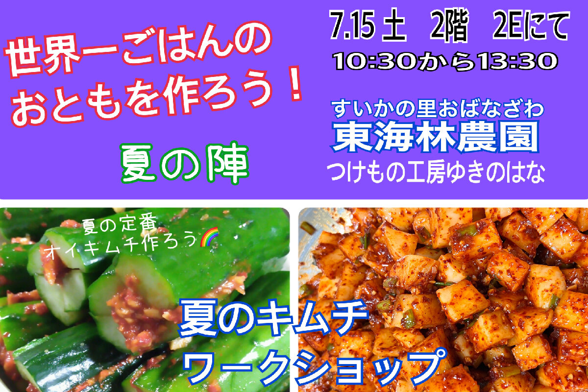 Q1[2-E]ツインキッチンを会場に、7月15日[土]10:30より「世界一ご飯のおともを作ろう夏の陣」が開催されます。夏野菜が美味しくなる頃、みんな大好きキムチを作りましょう。また、夏野菜を使ったお漬物も仕込みます。