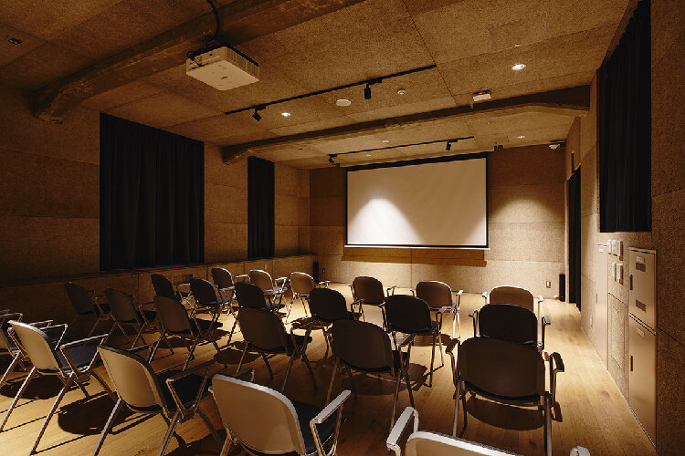 広々とした防音仕様のレンタルスペースです。大型のスクリーンと高出力スピーカー、4K対応のプロジェクターを完備したスペースです。映画の上映会や音楽会・撮影などの制作活動に加え、静かな空間での展示や大人数での会議などでもご利用いただけます。