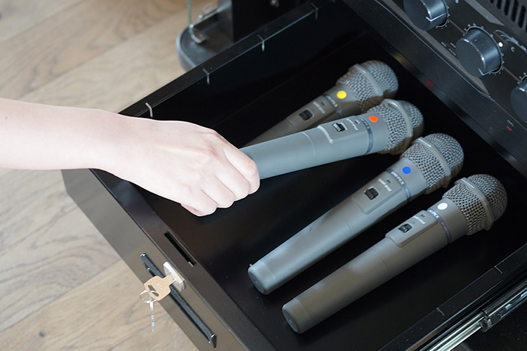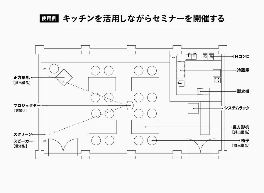 - スクリーン[180型]、プロジェクター[4K対応]、メインスピーカー[60W出力]、システムラック[Blu-ray・DVDプレイヤー等]、無線マイク[4本]、IHコンロ[2口]、冷蔵庫、製氷機、フリーWi-Fi